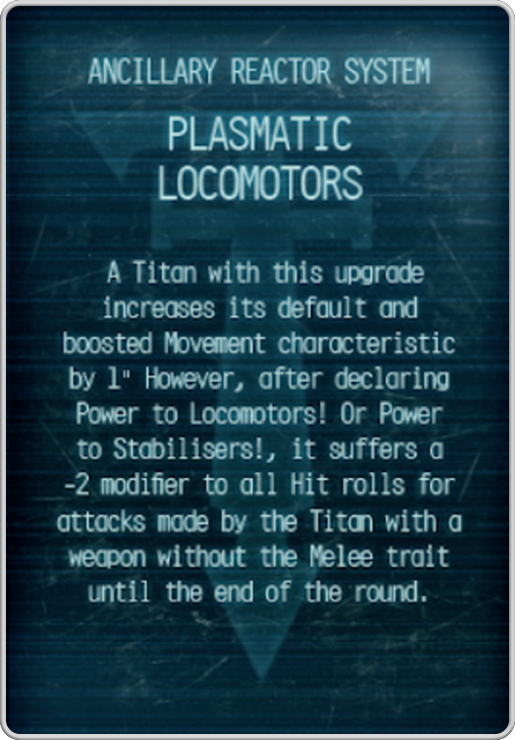 Experimental Locomotors is a great choice to get into position as you no longer have to risk the reactor roll. An interesting side effect is that using this with the Plasmatic Locomotors reactor will let you get the benefit without the -2 to hit afterwards - moving 7” a turn freely toward your prey. Just don't roll a 1 on the D10 in the End Phase or you lose the upgrade and take a Devastating to the Legs.In the unfortunate instance that the Warmaster does fall, Last Ditch Effort is crucial - it lets you decide what direction it will fall in, guaranteeing a 12” fall at strength 12, potentially forcing your opponent to pay dearly for daring to kill your centrepiece engine.