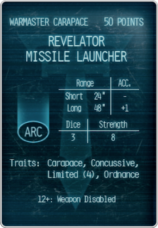 If having no voids and being hit by the Plasma Destructors wasn’t bad enough, the Revelator Missile Launcher says hello. Unlike the Apocalypse Missile Launcher which excels at breaking voids, the Revelator excels at going into armour thanks to it’s high strength paired with the Ordinance trait. Adding insult to injury, it also has the Concussive trait, possibly sending you into another engine or exposing your flank. Plus, the accuracy bonus at long range makes it that much easier to pick up a kill with called shots into a damaged location. Just don’t forget that your larger scale will make it easier for your prey to get within minimum range.