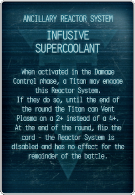 Infusive Supercoolant may seem overkill, but sometimes you need the peace of mind that you’ll be able to get your reactor under control in a critical moment, giving you the extra heat you need to keep firing on all cylinders. This is a solid pick if you’re going to be running very hot from using Draining or Maximal Fire weapons (of which you have no shortage) or Legio abilities such as Defensor’s or Fureans’.