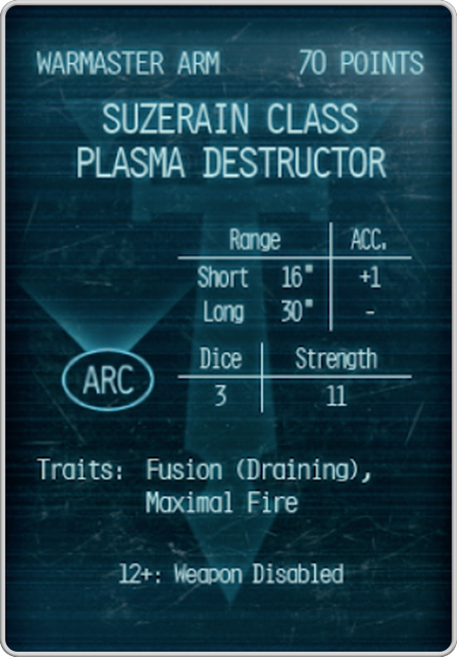 Ever wondered what would happen if a melta cannon and a Sunfury plasma annihilator had a kid, and that kid was just utterly hateful? Meet the Suzerain Plasma Destructor, currently your only choice for the Warmaster’s arms. Not that you really care, as they bring 3 shots each at S11, and can use Maximal Fire to get up to S13 in a pinch. and then being able to also push its reactor for Fusion within 16.