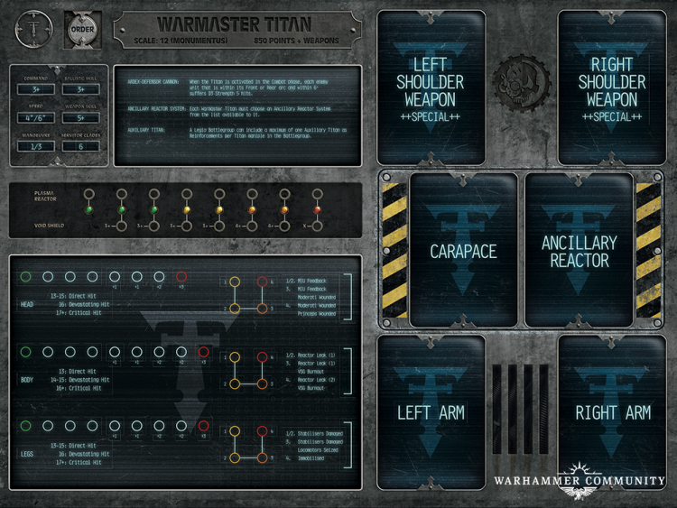 Its Void Shield, Reactor, and damage tracks are each 1 pip longer than a Warlord’s. Each damage track has 1 extra pip before giving a bonus to armour rolls, and there are 4 Critical Damage areas with the second Critical Damage effect of any other Titan not happening until it has suffered 3 Critical points of damage, making VSG burnout harder to get to. Also, the numbers needed to score Direct, Devastating, and Critical hits are nearly identical to a Warlord, the only difference being the only way to score a Devastating to the Head or Legs is by rolling a 16 - a 15 will deal a Direct hit instead.