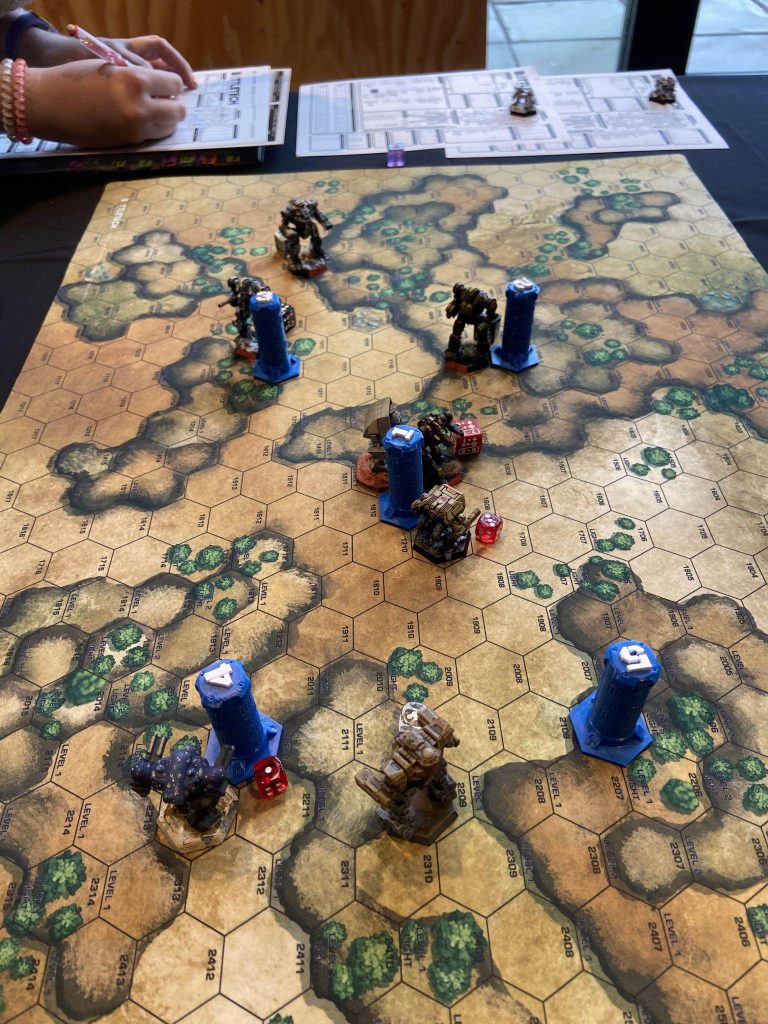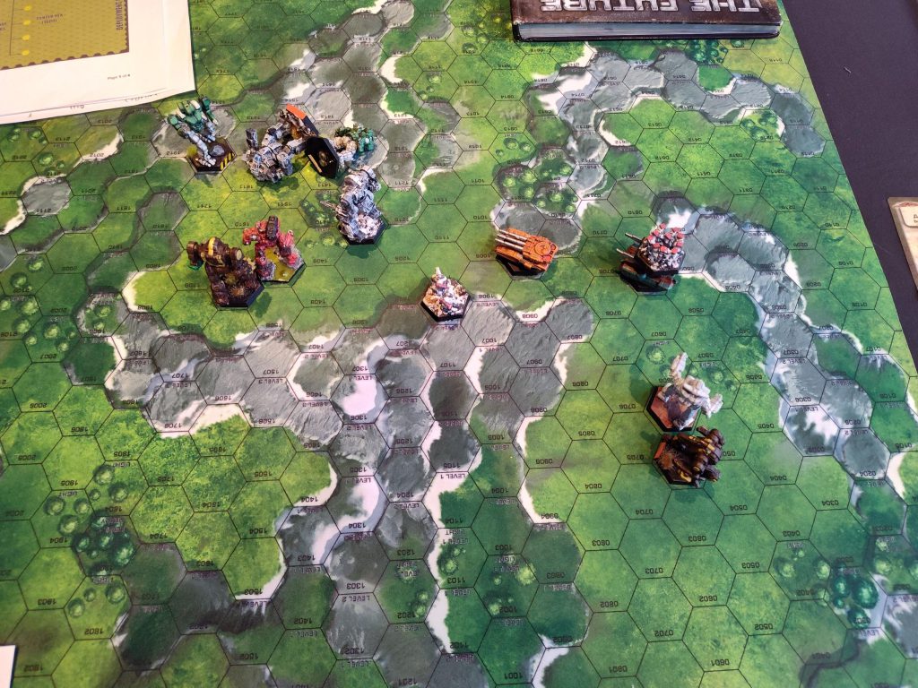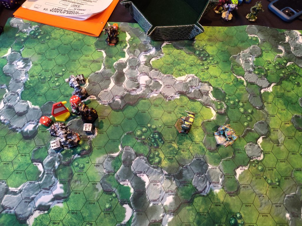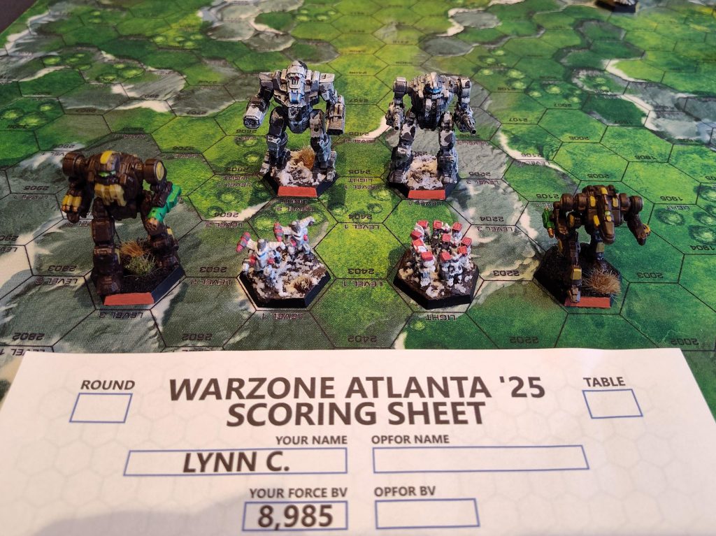 Forces for WZA were 9k BV, built off of Civil War era MUL listings, with a maximum of six units, including up to two vehicles and two battle armor squads. No ProtoMechs, no conventional infantry, no on-map artillery, no aerospace. We could bring up to 30 BSP of “Strikes” (e.g. air strikes, air cover, and artillery) per the new Mercenaries BSP rules. Scenarios were not shared with the players in advance of the tournament: Individual packets were placed on the tables 30 minutes or so before the start of each round, with a quick huddle right before round start to let us ask any immediate questions we might have in a public forum. Each scenario allowed players to earn up to 75 points through completing a primary objective, up to 50 points of kill scoring depending on what percentage of the opposing force’s BV they destroyed (with crippled units counting for 50% of their BV), and a 25 point bonus if you won the game, for a maximum of 150 points available in each round. The optional rules in play were Backward Level Changes, Careful Stand, One-Armed Prone Fire, Floating Criticals, Expanded Damage Modifiers, Enhanced Flamers, and Front-Loaded Initiative (technically a houserule). Forced Withdrawal was enforced, and the pilot of a crippled ‘Mech with a missing leg would automatically eject at end of round if they failed to stand up. (That this did not apply to vehicles which were both crippled and immobilized was a surprise tool which would hurt us later.) Players were to declare attackers and targets before any dice rolling took place, but didn’t have to declare what specific weapons/ammo they were firing until attack resolution (unless they were splitting their fire between targets). Each round was played on two mapsheets or one BattleMat, with the short sides as the starting edges.