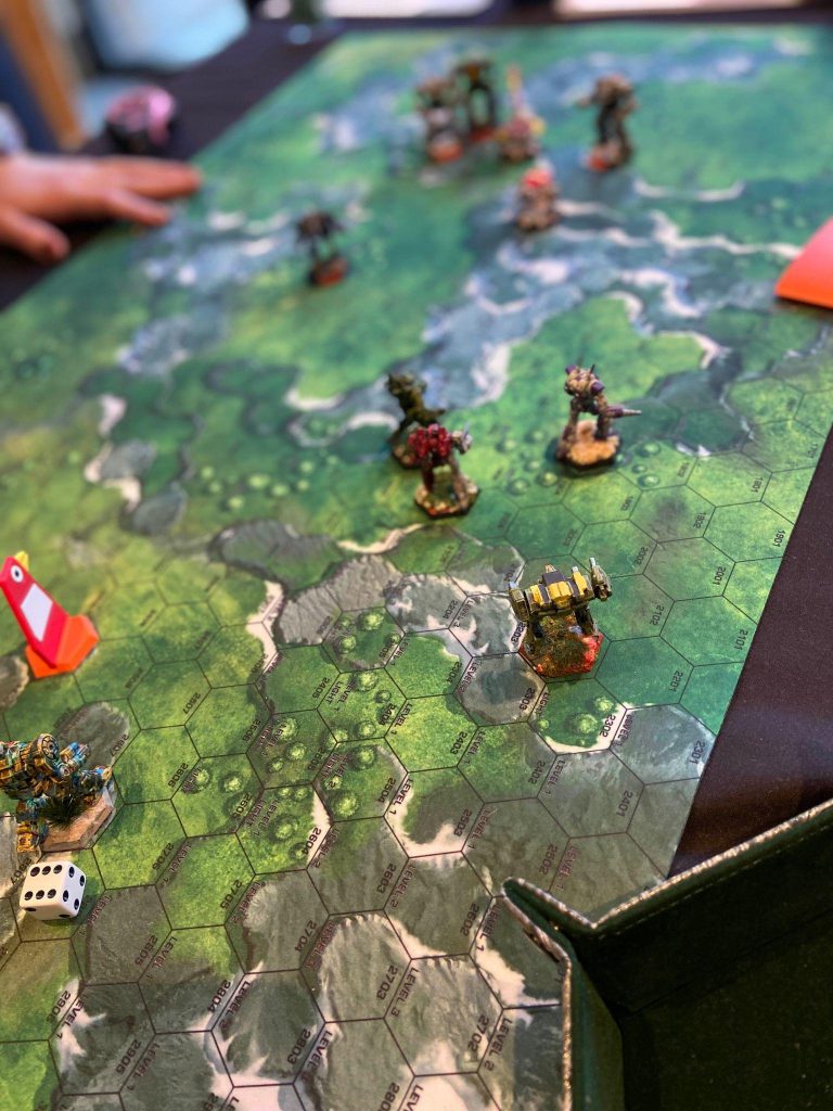 This was my least favorite of the scenarios, though that was partly just due to circumstances. This was a modified head-hunter scenario, with primary points scored by destroying your enemy's command ‘Mech, keeping your command ‘Mech alive, and destroying enemy units with your own command ‘Mech. There was a minor twist of an escalating bonus to Initiative if you lost initiative 2+ times in a row.
