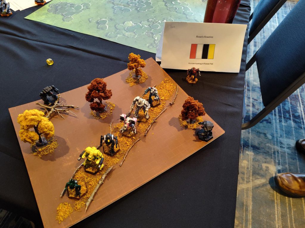 How it ended. Credit: Lynn CWith the fifth and final round in the books, it was time for awards! Certificates and Salvage Boxes were given out for a few specific accomplishments: “Heart of a MechWarrior” for bringing positivity and good cheer to the tournament, “Bold Strategy, Cotton” for bringing the force with the lowest BV total, “The Price is Right” for getting closest to 9k BV, “Focht Yeah!” for focusing on objectives over kills, “Honorable War Crimes” for focusing on kills over objectives, and “Didn’t Hear No Bell” as the obligatory Wooden Spoon.
