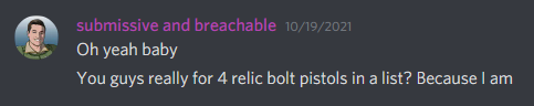 Greg: Bless Chase, for bringing what I legitimately thought was a Hear Me Out list he'd take to an actual RTT. The really incredible part of this is the Fortress of Redemption, a model with a footprint so big it will absolutely never be deployable. If the building ever does show up, two of the three To The Last units can't embark in it, and the lack of ObSec models means you can't take Stubborn Defiance. I'm not sure what I expected, but this was exactly it.Pros: