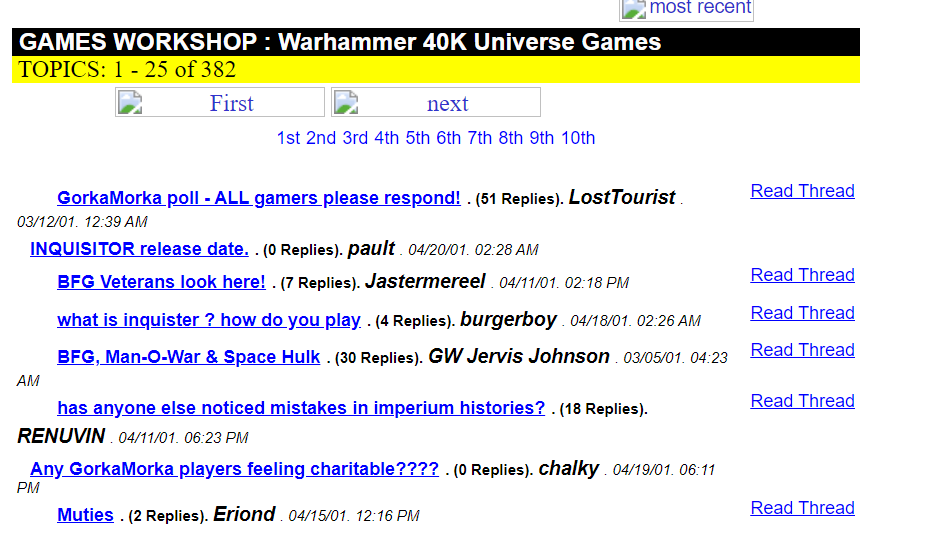 Some of the last Gorkamorka posts. Capture from GW "Warhammer 40,000 Worlds" subforum, December 2001. Via WaybackmachineThat doesn’t mean that Gorkamorka was forgotten about, or that it became an unspeakable blight on the system. For what it was - a six-month game about Orks bashed together by Andy and Gav from Necromunda and whatever plastic kits were in the pipeline - it was, and remains, extremely influential. Gorkamorka was a stepping stone to several new directions for Games Workshop, and not just financially. Gav, Andy, Nick, and Rick, who had all worked on the game to some extent, moved on to bigger things as a result. For Rick, Gorkamorka was a spur to set up the Specialist Games wing of GW after leaving the Studio, ensuring that no matter the financial strategy, GW long had a space for the niche, the exploratory, and the interesting. For Gav, Digganob was his first big solo project and in talking to him you can still hear the pride and challenge that taking on that opportunity entailed. Gav would go on to author dozens of codexes, editions of 40k, 50 published stories for the Black Library (and counting!) and what must amount to hundreds of White Dwarf articles. He says it “set the course of my career” and didn’t it just? It was a much less positive experience for Andy - the rush, the pressure, the whole attitude to the Studio must have sat poorly, and I can’t help but think it’s a step in the direction that leads us to his exit from GW, and the wider pastures we’ve already discussed in this series. For Nick, the experience led eventually to moving around GW and finally off and out to work on his own projects as a writer and artist with his company Alt World Studios. All four were involved in the next big project - Warhammer 40k - and given the time pressures on the studio, would have moved on very quickly. Lessons learned, and now applied to rejuvenate GW's flagship franchise.
