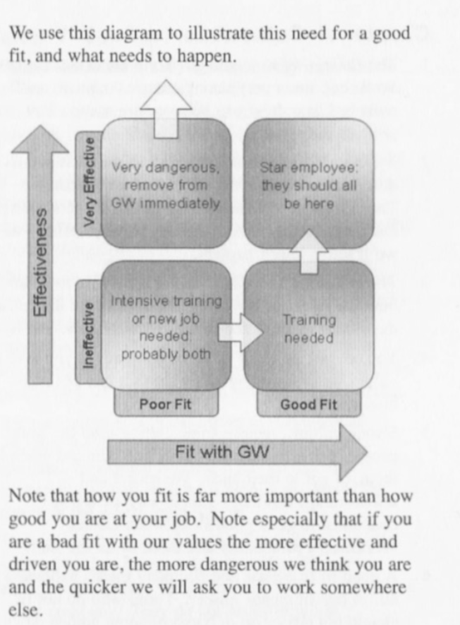 In the Black Book, those people are not a valuable resource you are trying to keep hold of, because the axis is not "motivation," it's "fit," and if you are high performance and low fit you are a threat. The wording in the diagram is stark: "Very dangerous, remove from GW immediately." The paragraph below continues, "Note that how you fit is far more important [emphasis ours] than how good you are at your job. Note especially that if you are a bad fit with our values the more effective and driven you are, the more dangerous we think you are and the quicker we will ask you to work somewhere else."