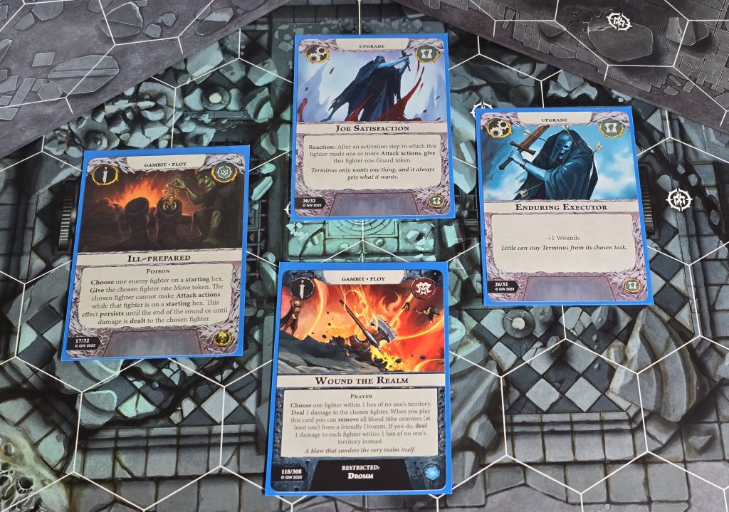 The last remaining type of cards are the other half of your power deck. These are gambits and serve the role of being a bucket that captures everything else. If it helps, think of them like instants or sorceries from Magic: the Gathering, or perhaps as stratagems from 40k – a wide variety of effects that further your gameplan, whether it’s a valuable push to reposition a fighter, a short term boost to an attack, or putting a scorpion in someone’s boots to mess up their plans. Aside from the ploys just mentioned, you’ll also find spells in this category which will require a wizard in your warband to cast it before the spell takes effect.