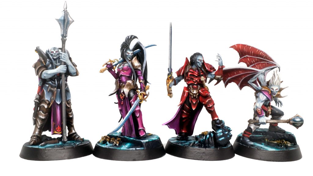 The Crimson Court: Four vampires, each with solid stats to be threatening on their own. They have a mechanic where they are constantly battling with their hunger. If they let it go unchecked, they become bloodthirsty. If they can overcome their hunger, they will inspire. They’re a flexible warband that can be built in a variety of ways in the formats with deck building.