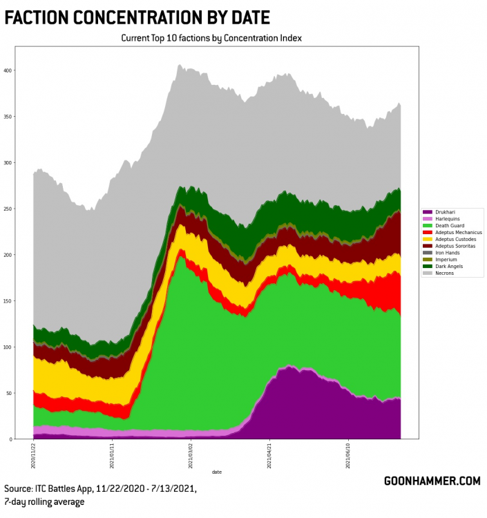 Looking at the top 10 factions by win rate/glicko score in the ITC Battles app data shows us how interest in the faction has grown since the release of the new book. While some expansion is always to be expected - new launches drive interest in a faction - continued growth of that faction tends to be more predicated on the competitive strength of that faction - hence, Death Guard play is still high (it's the most popular single Chaos faction as the only one sporting 2W marines), but down from the month of its release. Comparatively looking at the combined areas for Admech + Death Guard + Drukhari, you can easily see how Admech have eaten into the Drukhari share of games played over the last month following the book's release and nerfs to the Drukhari faction. Drukhari are still strong, but in this case we can easily visualize via data how some players made the switch, while the Death Guard share of games has remained relatively constant.