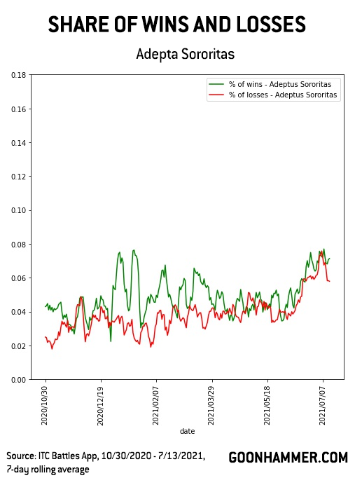 So far the growth of admech hasn't quite mirrored the astronomical win rate growth of Drukhari, but that wasn't necessarily realistic - the Adeptus Mechanicus were an average or above-average faction in terms of win rate and glicko score before their codex. Comparatively, Drukhari were one of the game's weaker factions, though they had been climbing slightly. In the wake of the book release we're starting to see similar trends to Drukhari as the Mechanicus' share of wins creeps upward and its share of losses drops. Compared to the other new codex - Adepta Sororitas - it's easy to see how the two books have different comparative power levels: Both factions have increased in popularity, increasing their share of wins and losses, but for sisters, whose win rates have stayed relatively even with their performance prior to the codex, both win and loss share have increased at around the same rate, meaning the faction's overall win percentage has stayed about the same.