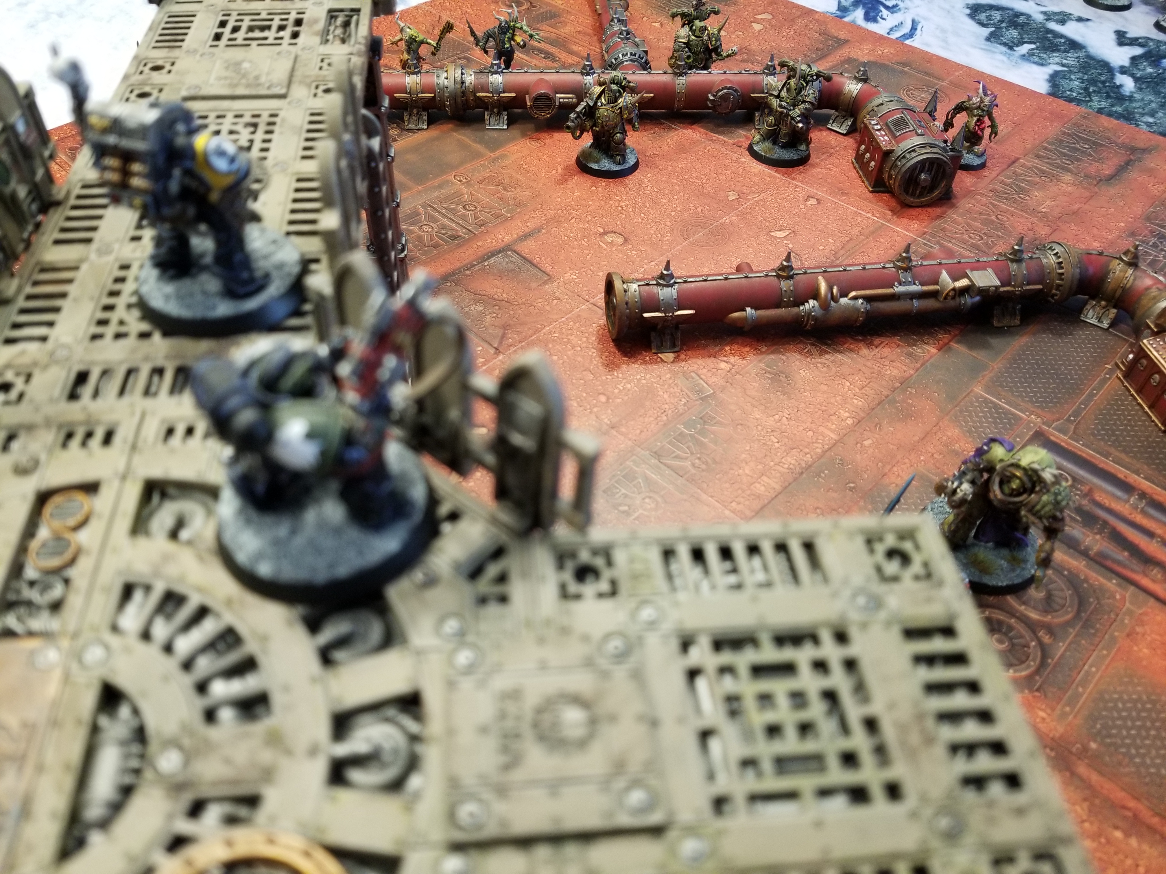 Welcome to the Thrios Extraction Plants, which should include lots of industrial structures and pipelines. This theatre is notable for at least having a very cool condition, which is that your objective markers, which are extraction rigs used to siphon natural resources, can literally be on fire. What resources, you ask? Well you roll a D3 before the game to determine if it’s Promethium, Noxious Fumes, or Charged Fumes in those pipes.An objective can be on fire, untouched, or put out, and you roll for each at the start of the game to get the starting state. As an action players can set objectives on fire or put them out. What the objective markers do depend on what resource you rolled, and whether the objective is on fire or has been put out (untouched objectives do nothing). Generally, on fire objectives are more dangerous to be around.