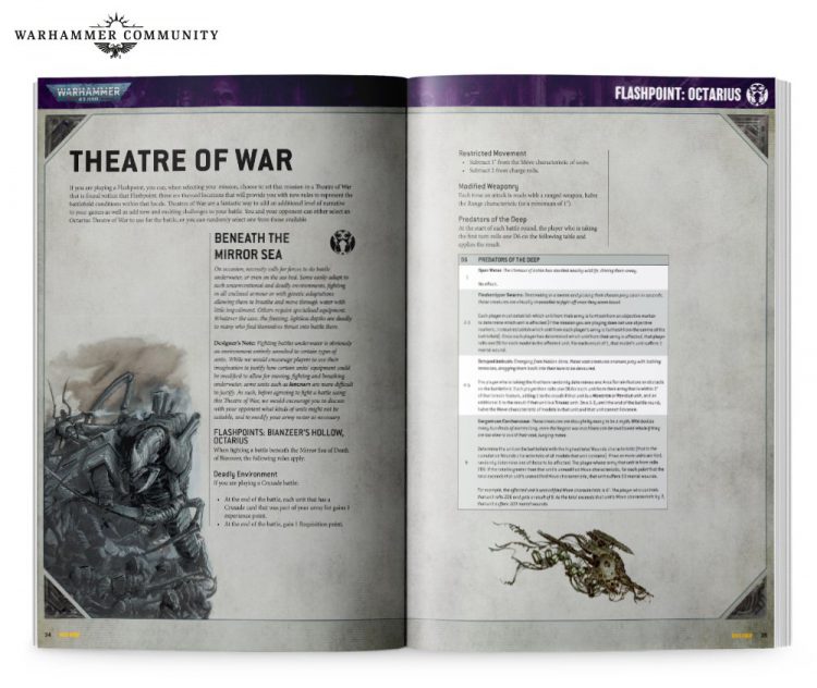 I love this thematically, if not mechanically. It's cool, but the problem 40k has with these kinds of things is that it’s not a video game. It’s all well and good to make a different biome digitally - a desert map, an ice map, a sewer planet - but a lot of that visual oomph is lost when you’re probably playing on the same mat and terrain that you already had. Map-based expansion packs, which is basically what Theaters of War are to 40k, only work if you put in the work to construct an entire experience around them. The main part of this being the tablescape and terrain, which is a fairly big ask unless you happen to own a game store. Even if you swap all your light bulbs for low-wattage blue gels, miniature tabletop gaming is just not well suited to capturing the cinematic feel here, and without that, they may as well be regular missions, only with extra rules to forget. As much as we appreciate the Out There nature of fighting on the seabed, it feels like maybe an overreach.