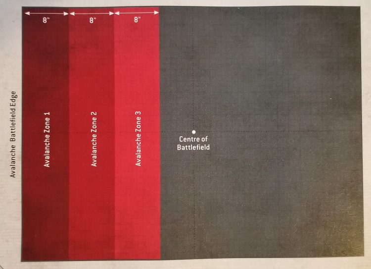The Avalanche effect Credit: White Dwarf"All right everyone, Chill". Devastating Avalanches is the major set piece of this Flashpoint. A series of avalanches advance 8” across the board for 3 battle rounds (starting on round 2, giving you time to get out of the way), causing Mortal Wounds to those non-FLYing units caught in its path, before becoming Difficult terrain for the rest of the game. On the plus side, as the avalanche area grows, these areas will also count as both Light and Heavy Cover for the rest of the game as well.