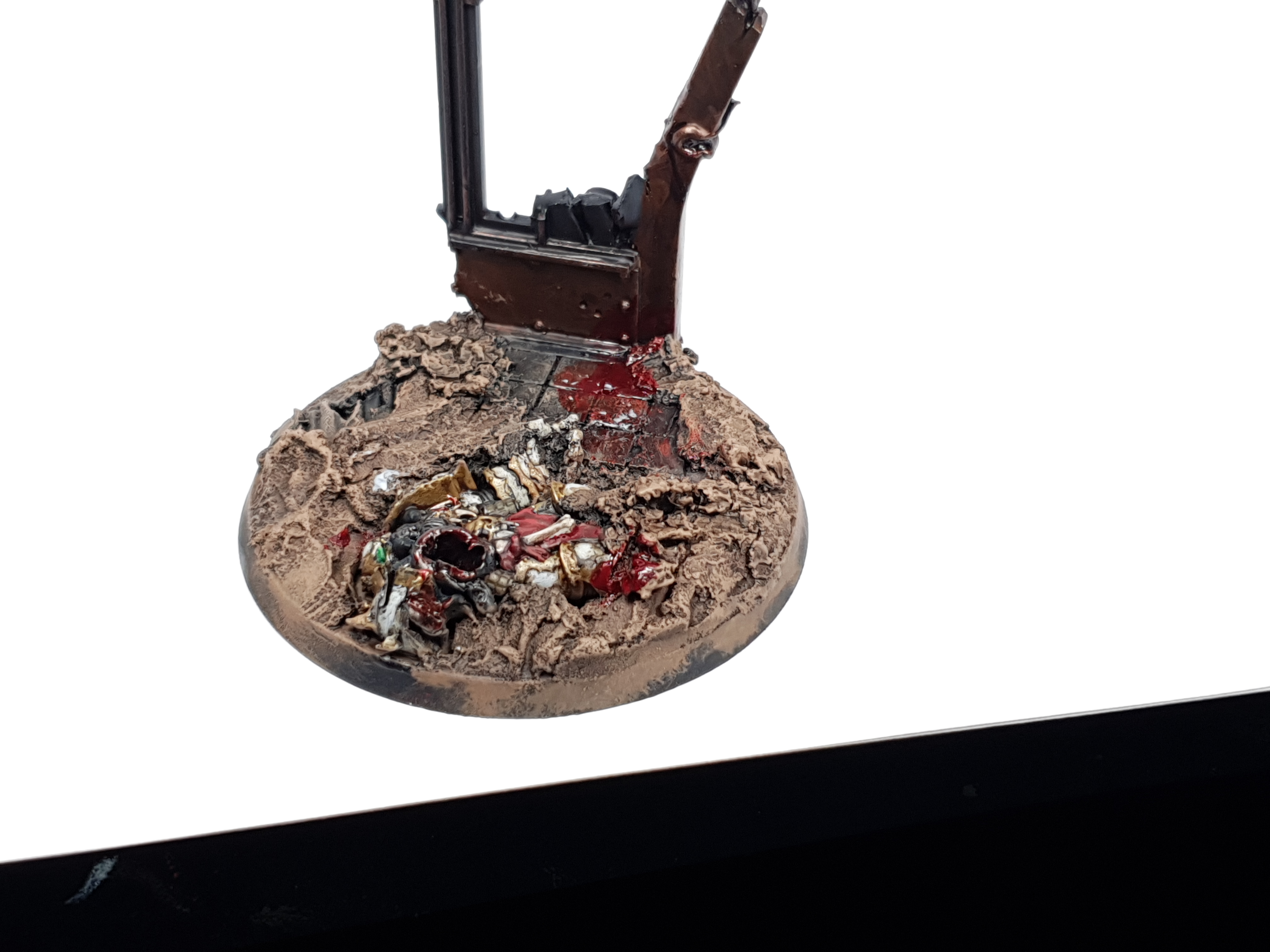 This base isn't done, note the rim. Once it's painted it will make the model 'feel' complete. More on that in a bit.The dread has two twin linked lascannons. So I have a bit of Davonic Badlands and a ruined portion of a building, I also have a very dead chaos marine killed by what appears of be a lascannon boring it's way though cover and into it's chest. The dread will be stepping through this scene, guns level and torso twisting. I'm hoping this gives the impression of a running battle, with the dread keeping up with the infantry advance while laying down coverfire.