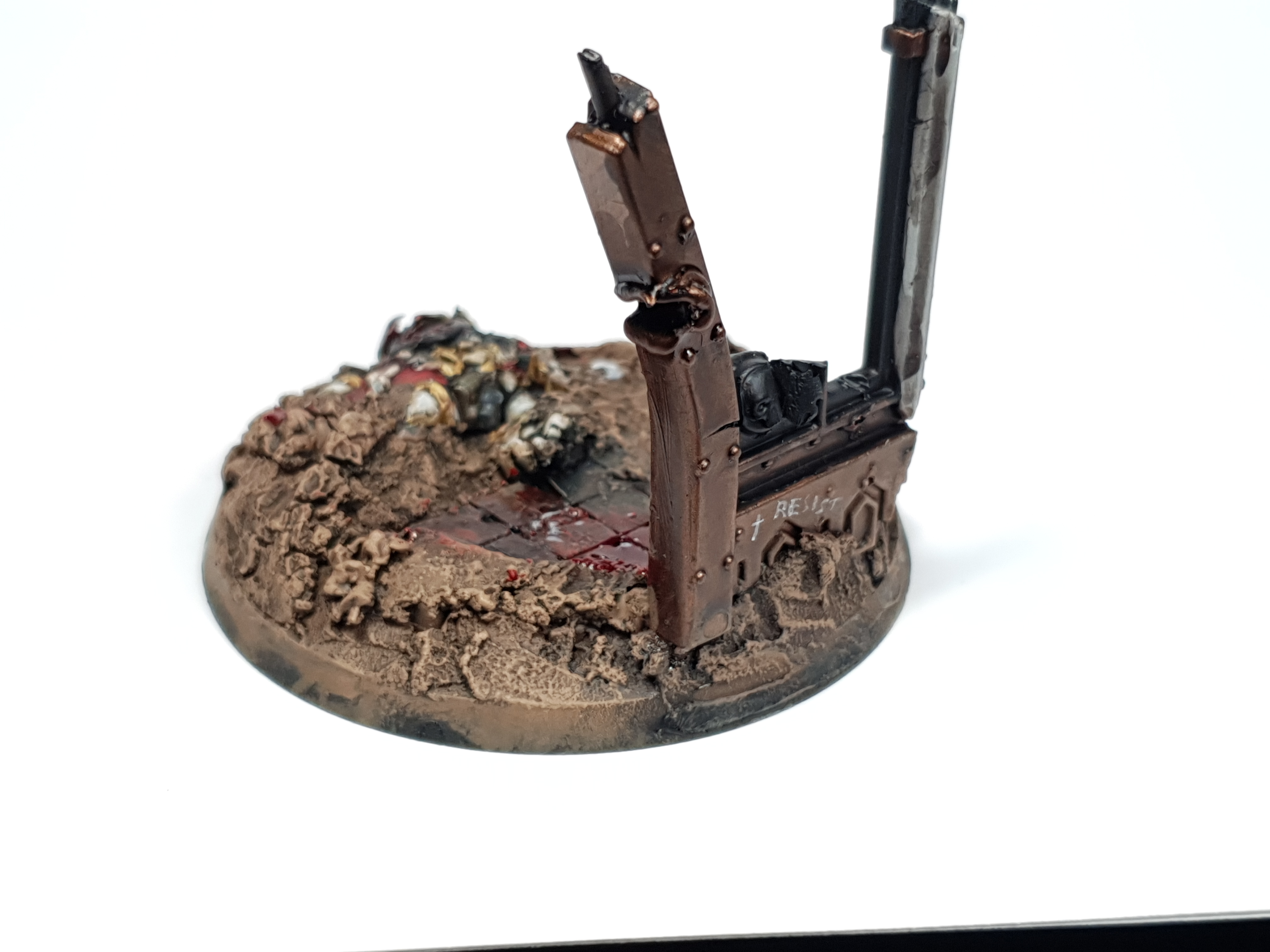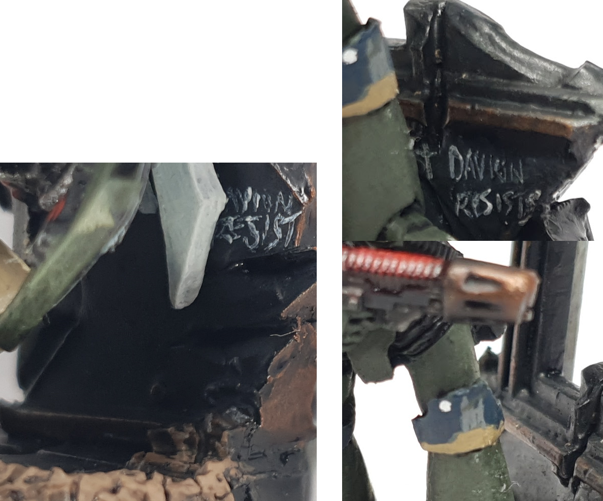 What themes do I want to show? This is a big one, that has developed with the army. For a bit of background, Davion Primus is the sector capital, which fell during the great rift and the Swords have a lot of Arthurian mythology in them. I show this by making sure of the structures on the base are obviously ruins and where they have swords they are painted white to reference the weapon Tiberius bears, The White Sword Of Davion, which acts as a excuilaber stand in. I also tie in that there is an active anti-chaos resistance by pro Imperial Davionic Republic forces with the little bits of "Davion Resists" graffiti with the little white chalk mark swords.