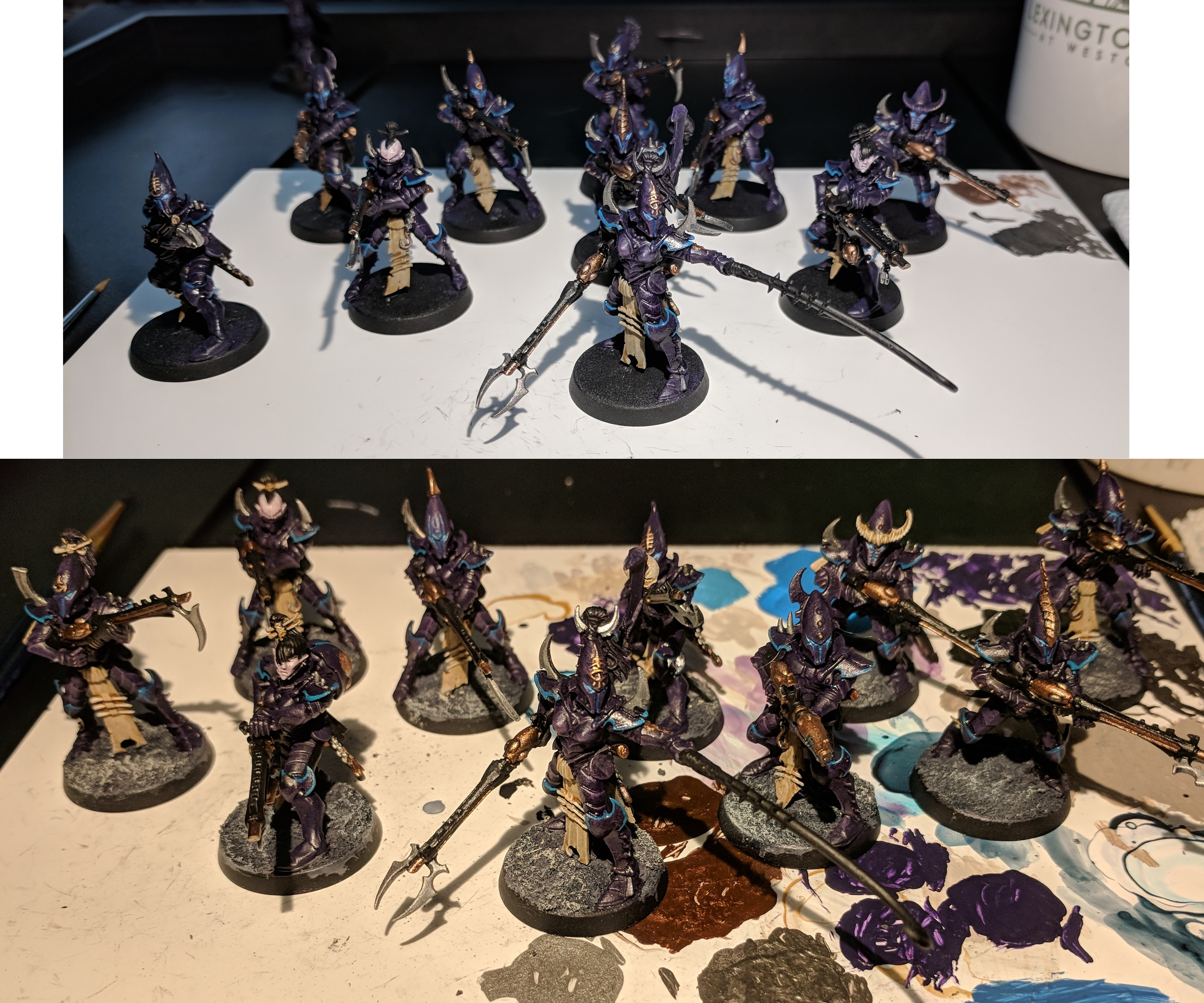 The kicker to all this is that great bases are relatively easy to pull off -- with the right method, basing can be a low effort and easy-as-heck way to improve the look of your army rapidly. For example, check out the before and after on the Dark Eldar by Garrett “John Condit” Severson below: