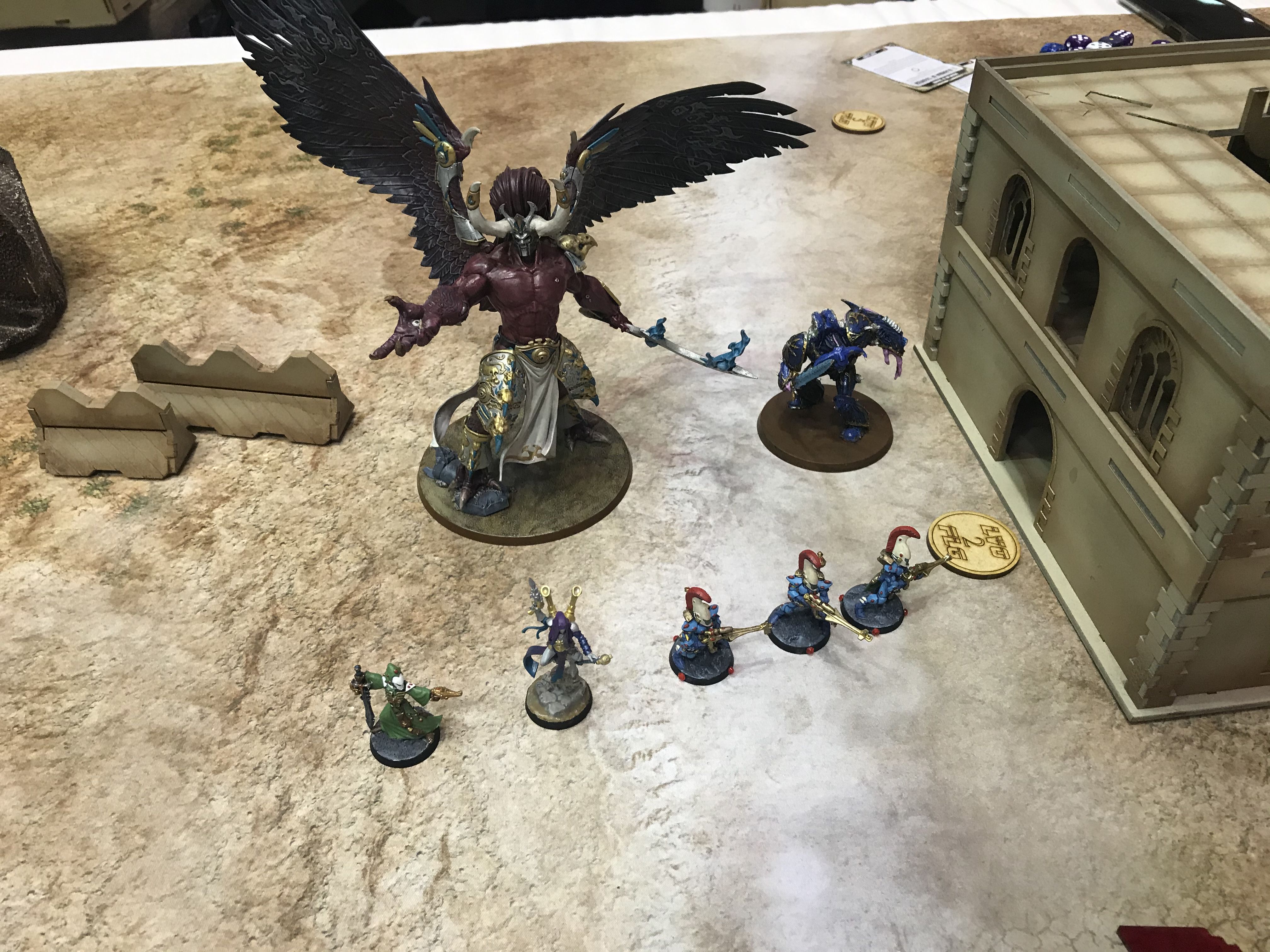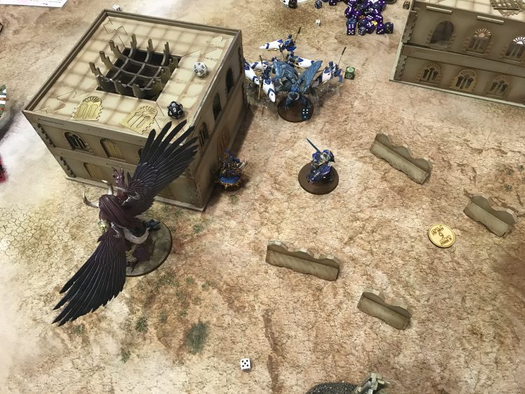 Hero Fire Prisms banish a Knight to the dead pile with Magnus.However, my army decided the game was not over on the spot by overperforming massively on turn 2, taking out Magnus and a Knight to put me firmly back in the game. We were playing a game with progressive scoring, and I focused on maximising my points from that, forcing his remaining two Knights to stomp around the board prising my stuff out from ruins and using all the now-departed flyer move blocking tricks to lock them in place.