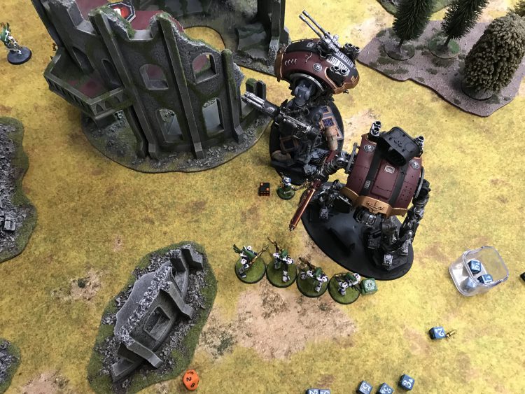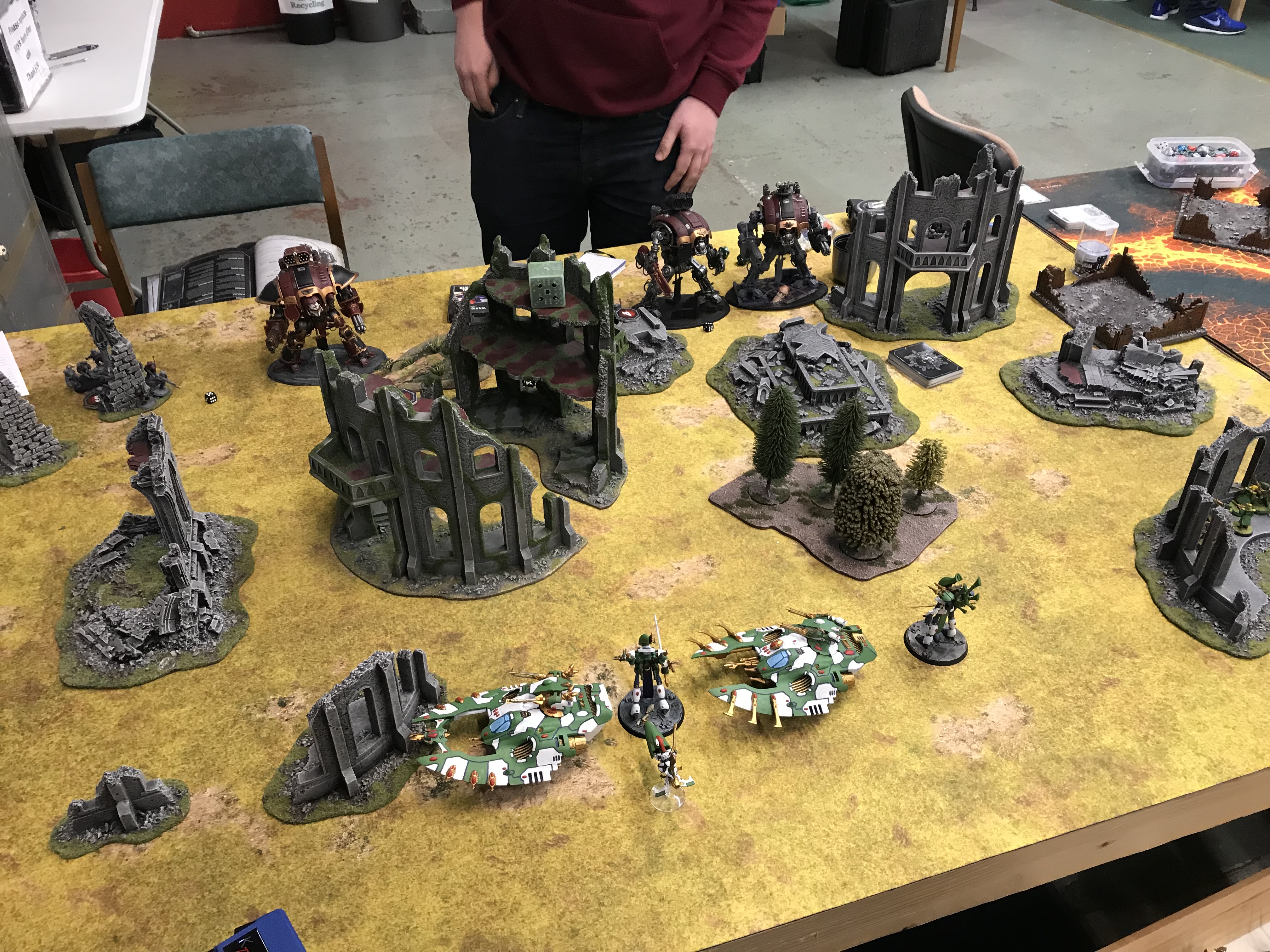 Luckily (?) for me Knights was what Chris had - but not a loyalist Castellan, instead packing Magnus and three large robot friends. We were playing with the 2018 ETC event pack, something that list was especially well suited for, as it tended to score maximum differential kill points. The format also awarded max points for tabling your opponent - something this list was quite capable of doing it.