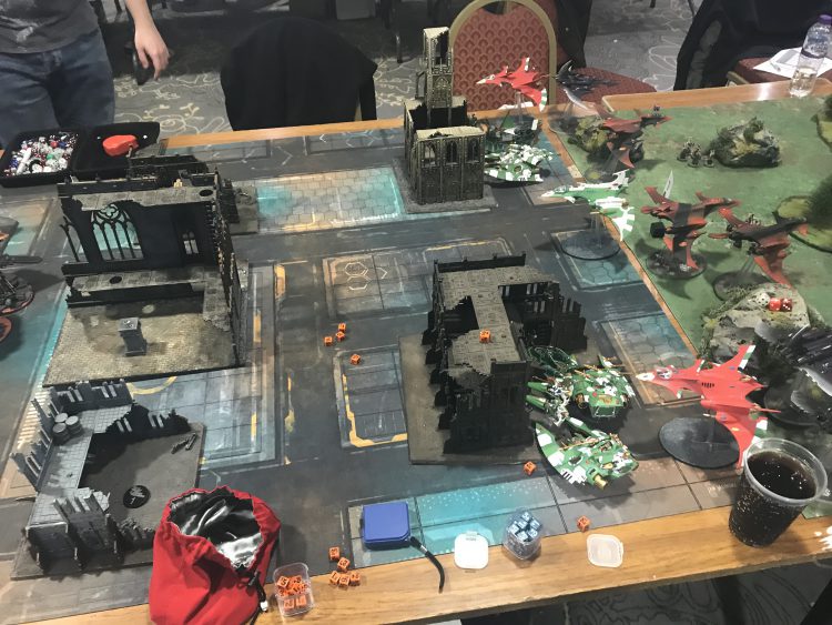 I played against Chris as my first game on day 2 of the Glasshammer open in the 2-1 bracket. I had a mechanised Eldar list sporting planes and Wave Serpents (this is uh, going to be a theme) but also including some Drukhari Scourges, as at that time you could use Doom to turbo charge these against Knights - this was in the period where super-powered Castellans were very much all the rage.