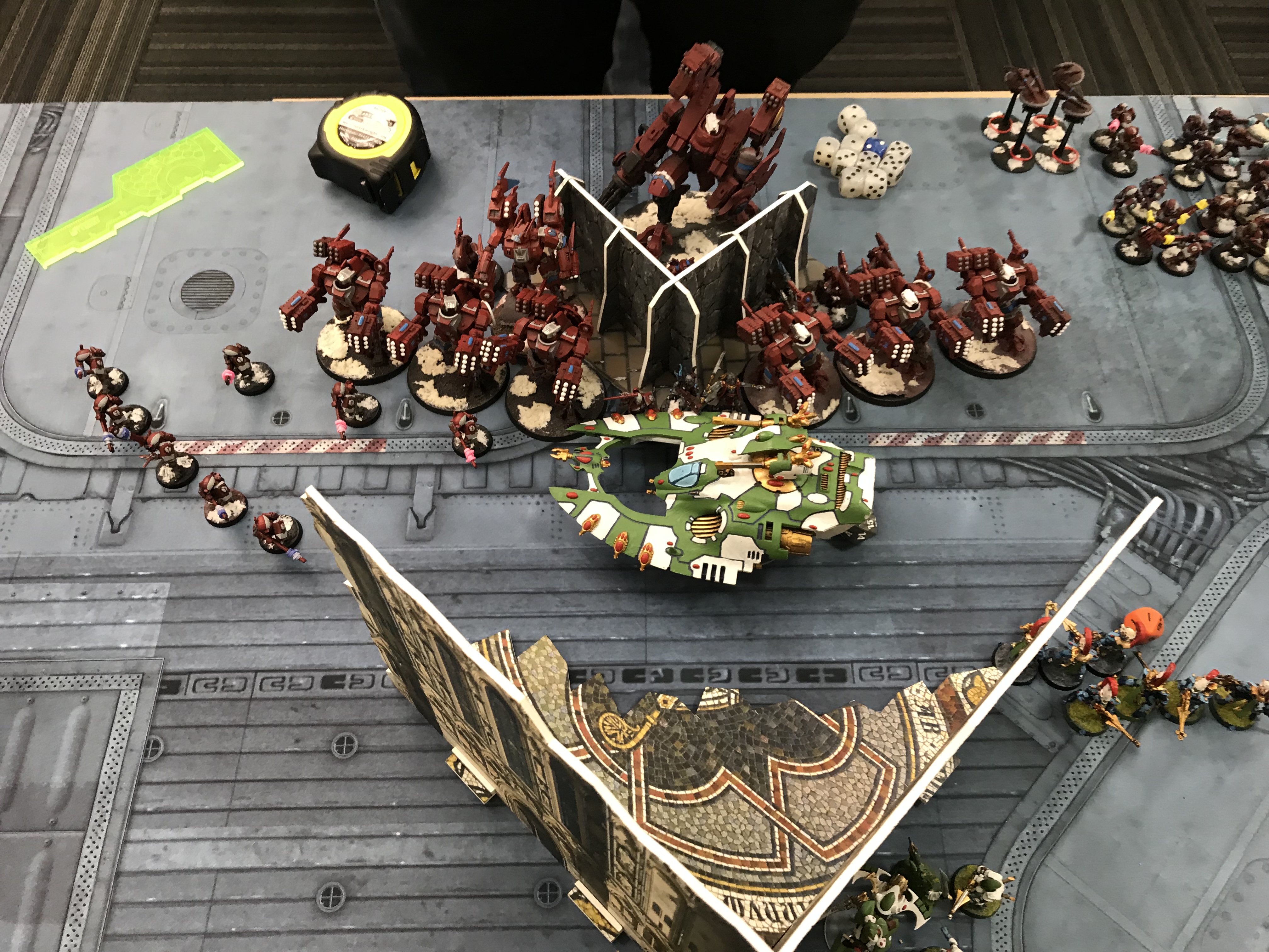 Tactical use of Lov'Hart doctrineI had a refined version of my mechanised Eldar/Drukhari lists, featuring two (here largely useless) squads of Scourges as a nod to the number of Knights in the metagame, while Kyle had a Shadowsun castle Tau list featuring two big units of Broadsides and a lot of drones. Could I smash the castle open?