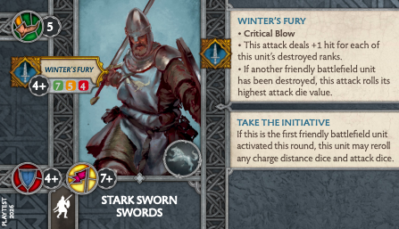 Stark Sworn Swords are a cheap useful tool for the roster. Whilst they brandish nothing too fancy in terms of rules, they have enough of a bite to be able to hold their own against units of a similar value. Some attachments can increase their usefulness if you are struggling for points for other options. My only criticism is for Take the Initiative. The Sword Swords rules lean into a late game boost for the unit, where they want to be reduced down in number whilst outlasting other forces, and then be the first thing to activate. It is far too many hoops to jump through to get a significant bonus and thus won’t trigger that often if ever.