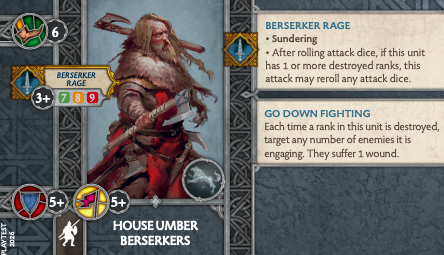 Attachment Choice: Greatjon (Commander version) This unit benefits greatly from ‘Fury of House Umber’ and the extra dice from ‘Berzerker Tactics’ are more powerful when the opponent cannot block them with armour.