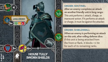 Attachment Choice: Brynden Tully. The boost to this unit’s already great defensive stats mean that you can leave this unit to activate until late in the round, and your opponent can waste effort attacking the stalwart knights or attack elsewhere and trigger ‘Sentinel.’