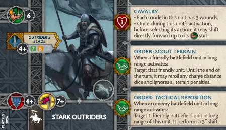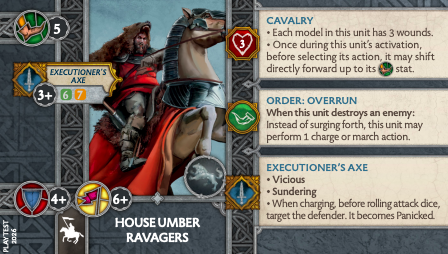 Changes - Worsened morale by 1. Attack dice decreased by 1 on final rank. Cavalry free maneuver has changed to a shift forward equal to their movement value. Vicious is now innate, with the panic token on a charge rather than both from last rank. Gained the order Overrun.Tim - ‘Overrun’ is more powerful than ever, this unit is extremely threatening and received a defensive buff. Attachment Choice: Winterfell Guardian. This unit really wants to stay in the fight long enough to use its ‘Overrun’ order.