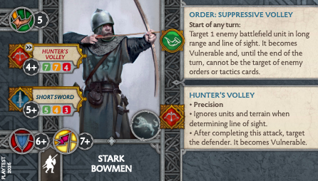 Changes - Morale has worsened by one to 7+. Final rank has increased by 1 to 5. Arrow Volley has been significantly reworked to Hunter’s Volley; still ignores line of sight but instead of a weakened token if you did any wounds, the unit becomes vulnerable after the attack. On top of this it also gained precision. Gained Suppressive Volley order where you can make aunty in long ranged vulnerable and it cannot be the target of enemy orders or tactics cards.Tim - This unit is a useful support unit, the ’Suppressive Volley’ order provides a much needed Vulnerable Token and could be even more powerful against enemies with defensive orders. This unit would be well placed beside some Tully Sworn Shields to protect them while the Cavaliers attack. Attachment Choice: Rob Stark. Enhanced mobility allows this unit to disengage when threatened and is a reasonable place for commander Rob to sit.