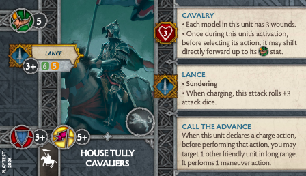 Changes - Attack dice change from 5/4 to 6/5. Cavalry free maneuver has changed to a shift forward equal to their movement value. Lance has changed from +2 dice per rank on the charge to +3 dice on the change. Rally Banner replaced with Call the Advance; an ability which gives another unit in long range a free maneuver when this unit charges.Tim - This unit has everything. An intense number of attack dice, if you have stark bowmen supporting them they will very happily attack enemies head on, and when they do they can position your next unit to mop up any survivors with ‘Call the Advance.’