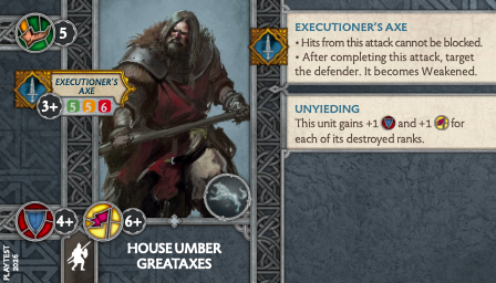 A very strong unit that shines inside of a Greatjon list. It will end up becoming tough to kill whilst dealing out a lot of wounds. Your only hope is weakened tokens and negative modifiers to hit. If you can stop the Greatjon’s card you can blunt the unit’s devastating combinations, but it may be futile. I can see Greataxes becoming a firm favourite pick going forward. They might be just a tad too strong though. Imagine them with a Umber Champion, regaining their Vicious, and now blocking hits alongside their amazing defence values. It reminds me when Hardened was really strong and you saw Mormont Veterans in Berserkers for super tough Stark lists.