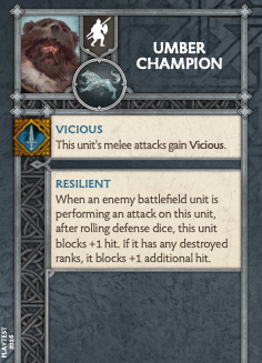 Umber Ravagers - Painted by Tim - Insta: tim_paintsDeath Before Chains - This card provides Vicious and extra movement, whilst giving Greatjon reroll charges. The Vicious is misplaced since you would double up on this with Greatjon, Umber Champion, and Umber Ravagers. It may be a card better used on non-Umber units to give them that Umber feel? It is weird but can increase a threat range for a unit.