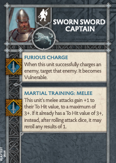 Sworn Sword Captain - Martial Training no longer grants rerolls and a vulnerable token, and now grants a +1 to hit or reroll 1s on the attack if you already have +1 to hit. Also gained Furious Charge. I don’t think this fits well with any units we have seen so far, other than Sworn Swords if you have the points for it. I expect this attachment could get better when we see the other units in the roster like the Karstark Loyalists.