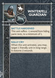 Winterfel Guardian - CMONWinterfell Guardian - Dauntless and Stubborn Tenacity are replaced with Battle Hardened and Rally Cry. The unit this attachment is in suffers -1 wound from failing morale and when it activates can heal a unit in long range two wounds. As things change, the more they stay the same. Adding this guy to your Tully Cavaliers feels like nothing was nerfed. You’re still healing, but now likely less than before, but you are a lot faster. It feels like a no brainer no matter what cavalry you bring.