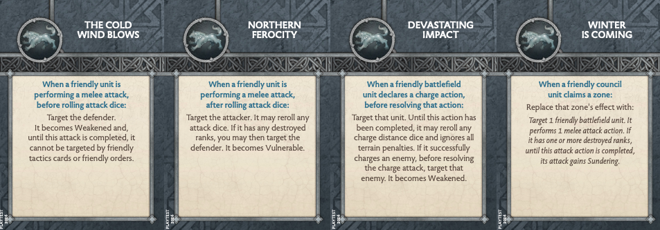 Winter is Coming - A completed rework but feels like Assault Orders. Instead of stripping a unit of Orders and Tactics Cards it now allows a council unit to replace a zone with a free melee attack which may gain sundering if you have destroyed ranks. This will be a strong card for the Starks to ensure the destruction of an enemy, and plays well with Northern Ferocity to make sure you end an opponent quickly.