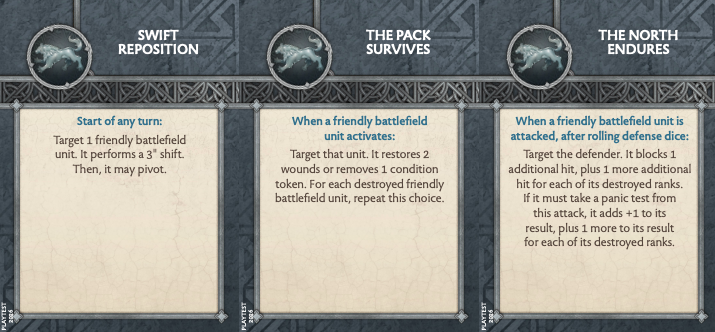 Changes - Morale has worsened by one to 7+. Final rank has increased by 2 to 6. Cavalry free maneuver has changed to a shift forward equal to their movement value. Ambush removed. Tactical Reposition has been reworked to trigger when an enemy unit activates, and you can target a unit in long range for a 3” shift instead of short. New order of Scout Terrain added, this gives a friendly unit reroll charges and ignore terrain penalties.Tim - This unit is now a purely support unit, the reduced mobility of 2026 cavalry, reduced morale and removal of ambush makes this unit very unlikely to do much on its own. The orders that this unit have benefit the other Stark units in long range, very much in keeping with the wolf-pack theme of the army. Attachment choice: None, this unit is not here to perform a combat role.