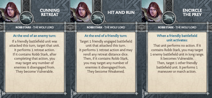 Changes - Tactical Reposition is replaced with Wolf’s Cunning; this is almost the same except it has a different trigger and can provide a pivot.Sudden Retreat is now Cunning Retreat trading the reroll on the retreat if it is Robb’s unit to vulnerable tokens to each unit he was engaged with. Hit and Run had a trigger change which means Relentless and Sentinel units will get to attack you before you flee, but you now get rerolls on the retreat. The terrible Superior Positioning card is replaced with Encircle the Prey, this is similar to Cunning Ploy dishing out a token and trading a unit's action for another to have a maneuver or march.