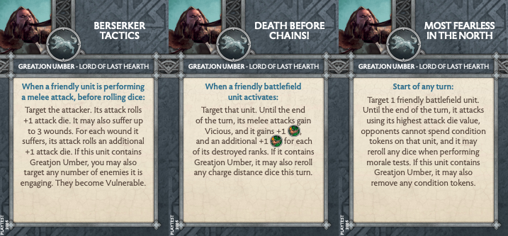 The unkillable stats are moved to the Greataxes and in its place comes a powerful combat unit. The lack in defence could see them fall to light damage quite easily now, but you will need to contend with a horde of dice with Sundering and likely rerolls. A game against them could be all about who blinks first. An Umber Champion is ideal in this unit whilst using the North Remembers card could be crucial.