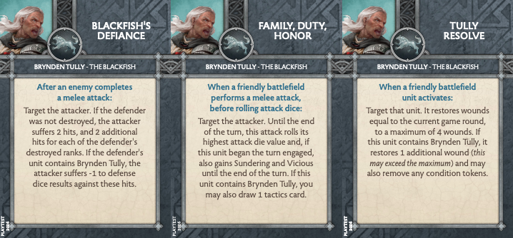 Family, Duty, Honour - The words of house Tully provide you with Sundering, Vicious, and highest attack dice if your unit was engaged at the beginning of the turn. If it targets Brynden you draw a tactics card. I can see this being a very strong card, especially combined with Winter is Coming. It is a strong card to use with Tully Sworn Shields which Brynden should be attached to.