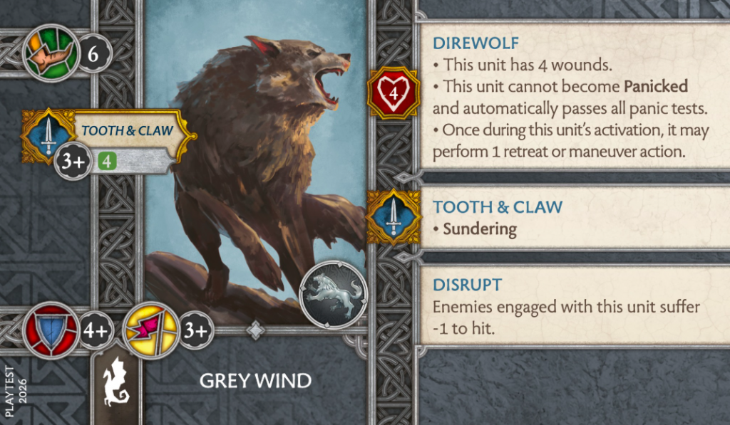 Direwolves are back on the menu boys! They are now the most mobile unit in the game, and have become more survivable thanks to the panic changes. Grey Wind is a particular thorn that Tim lodges in my side whenever I play against his Starks. Whenever Grey Wind is on the table I have to remove him, and now this feeling is reinforced by his changes. Triple Direwolves could become the meta since Robb is pretty decent and they are super mobile. I can see Grey Wind in every list possible, as well as his siblings. The wolf pack will be a terrifying sight on the table.