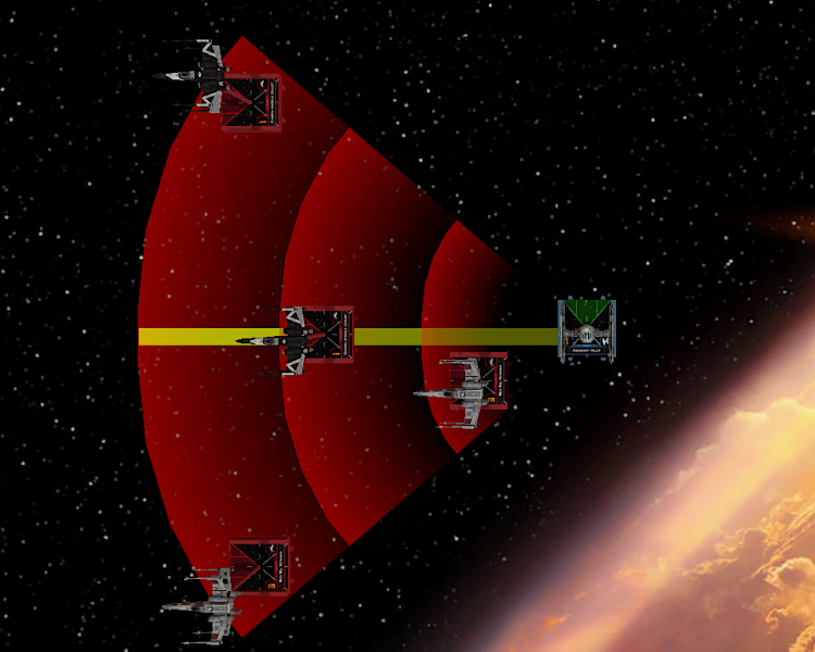 - Other maneuver decisions are bizarre, like the use of obstacles as a reference point. Ships may fly directly toward the nearest obstacle on purpose, making it fairly likely they’ll smash into them. This happens enough with a mindless opponent – no need to program ships to crash on purpose! This is probably intended to help ships hook maneuvers around obstacles and give them some unpredictability, but still seems silly and doesn't work well in practice. Introducing range bands into the decision-making, as mentioned earlier, might allow for "smarter" ways for ships to interact with obstacles.