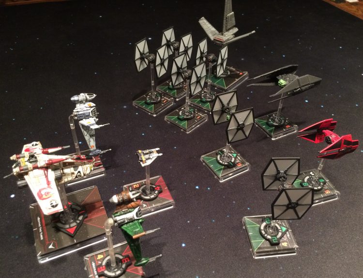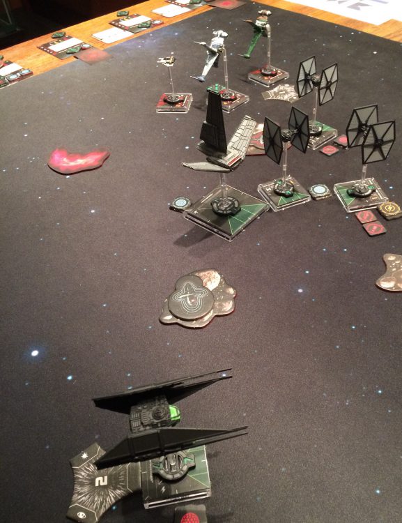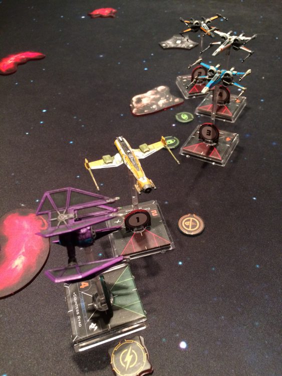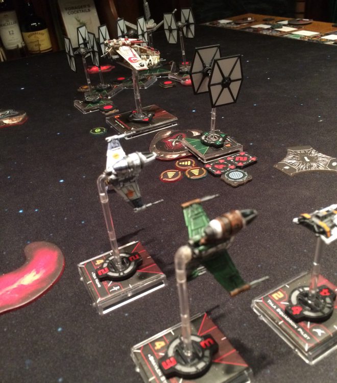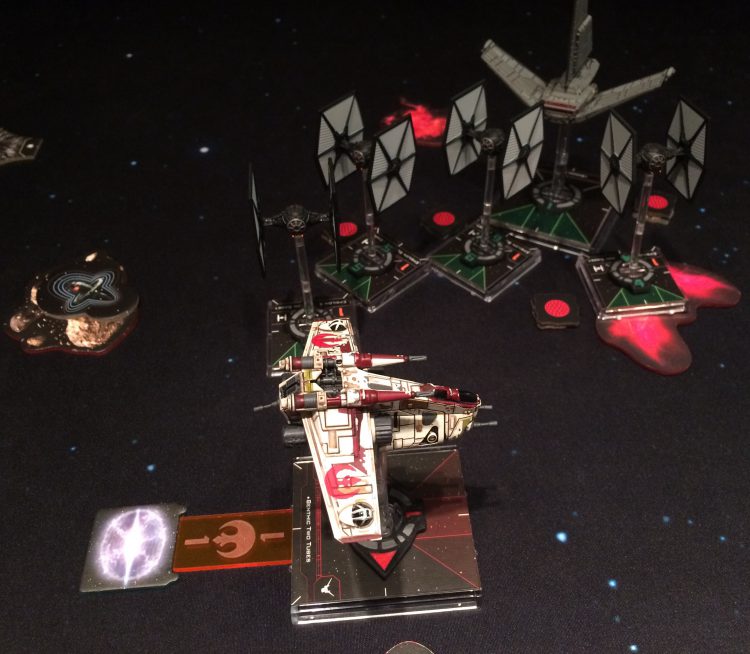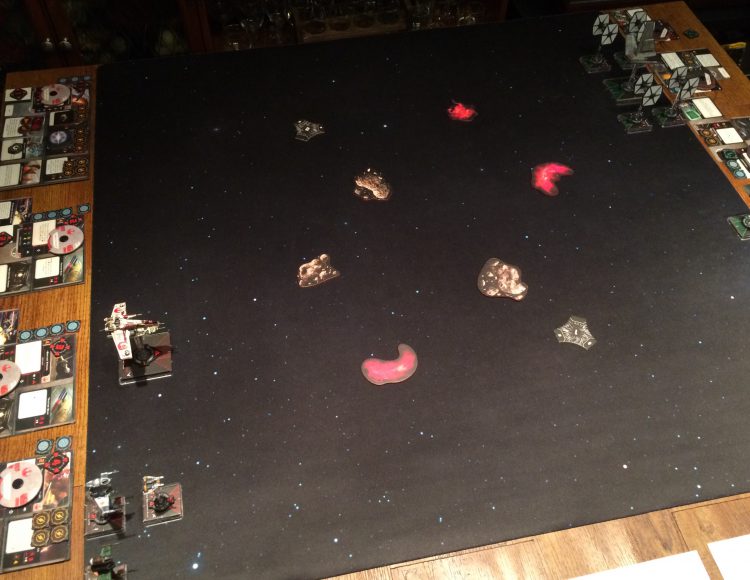 This wound up being a very different game from the last! Not only did I get my butt handed to me, but the Solo ships actually felt like they were being played by a real opponent. The Imperial aces, with their intelligent maneuvers and action selection, stayed close to the Rebel ships and had impressive time on target.