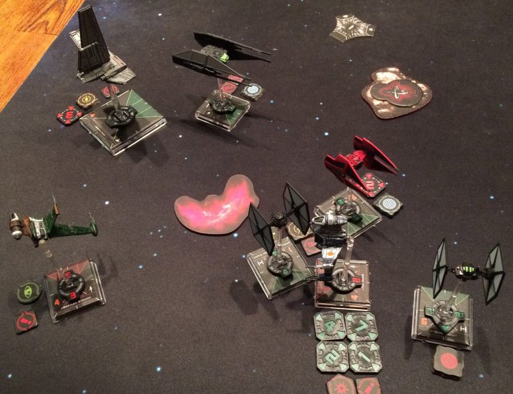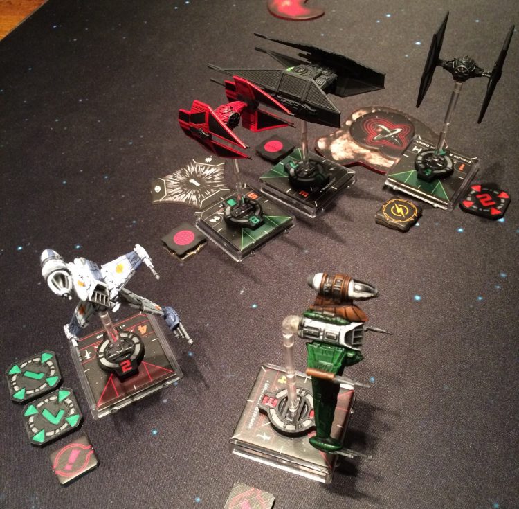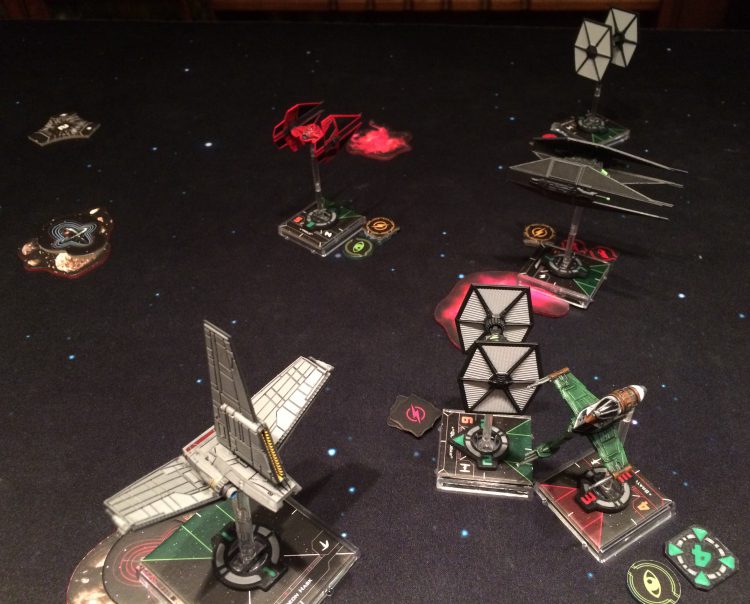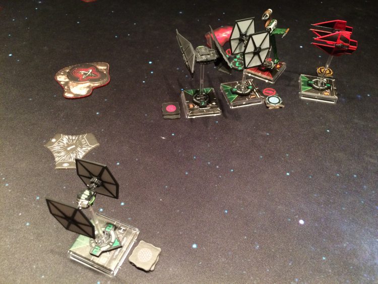 - Turn 1: All four of the TIE/fo, incredibly, make the exact same blank/hit roll for their maneuvers. This allows them to approach in formation ahead of the Xi Shuttle.