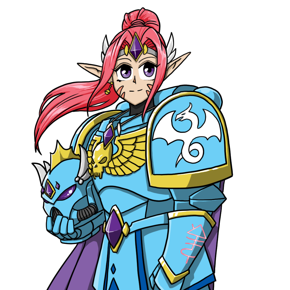 TheChirurgeon: *Reading notes from DeviantArt*... OK so looking at this it looks like this is the official art of the II Legion primarch, Utena Usagi Pendragon. She’s half-Eldar, and has psychic powers on the Emperor’s level. As primarch of the II Legion, the Psydragons, she rides around on a giant white dragon with blue eyes.