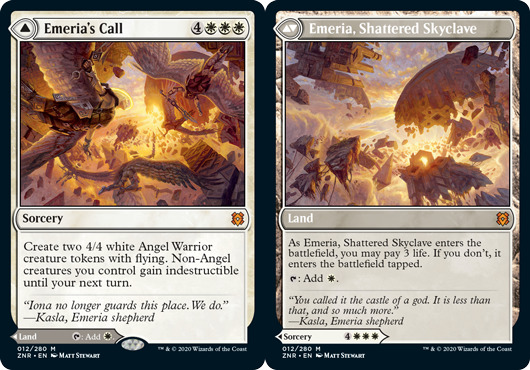 That powerful new card type? Modal Double-Faced Cards! These cards have two faces, one on each side, but they don’t transform like before. When you play one of these, you choose which face you are playing. As you might expect in Zendikar, these cards all are spells that can be lands, creatures that can be lands, or lands... that can be lands.
